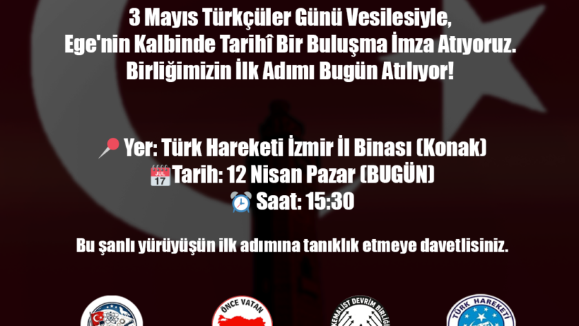 İZMİR’DE TÜRKÇÜ BİRLİĞİ : 3 MAYIS RUHUYLA TEK YUMRUK! Nisan 12, 20260CommentsTürk tarihinin şanlı direniş ve diriliş sembolü olan 3 Mayıs Türkçüler Günü vesilesiyle, Ege’nin kalbi İzmir’de faaliyet gösteren tüm Türkçü dernekler ve teşkilatlar olarak; tarihi bir irade beyan ediyoruz. Sadece belirli…Read More